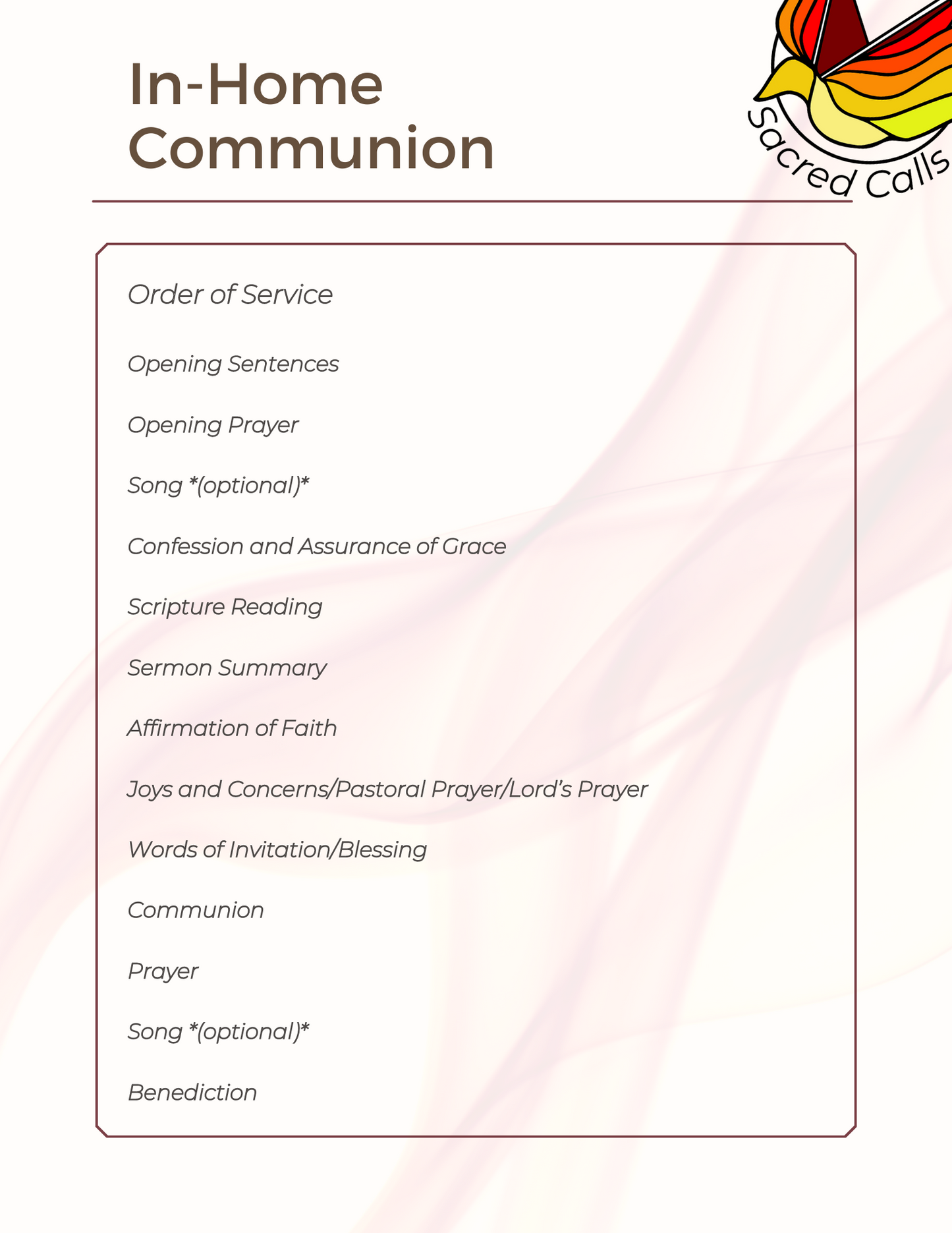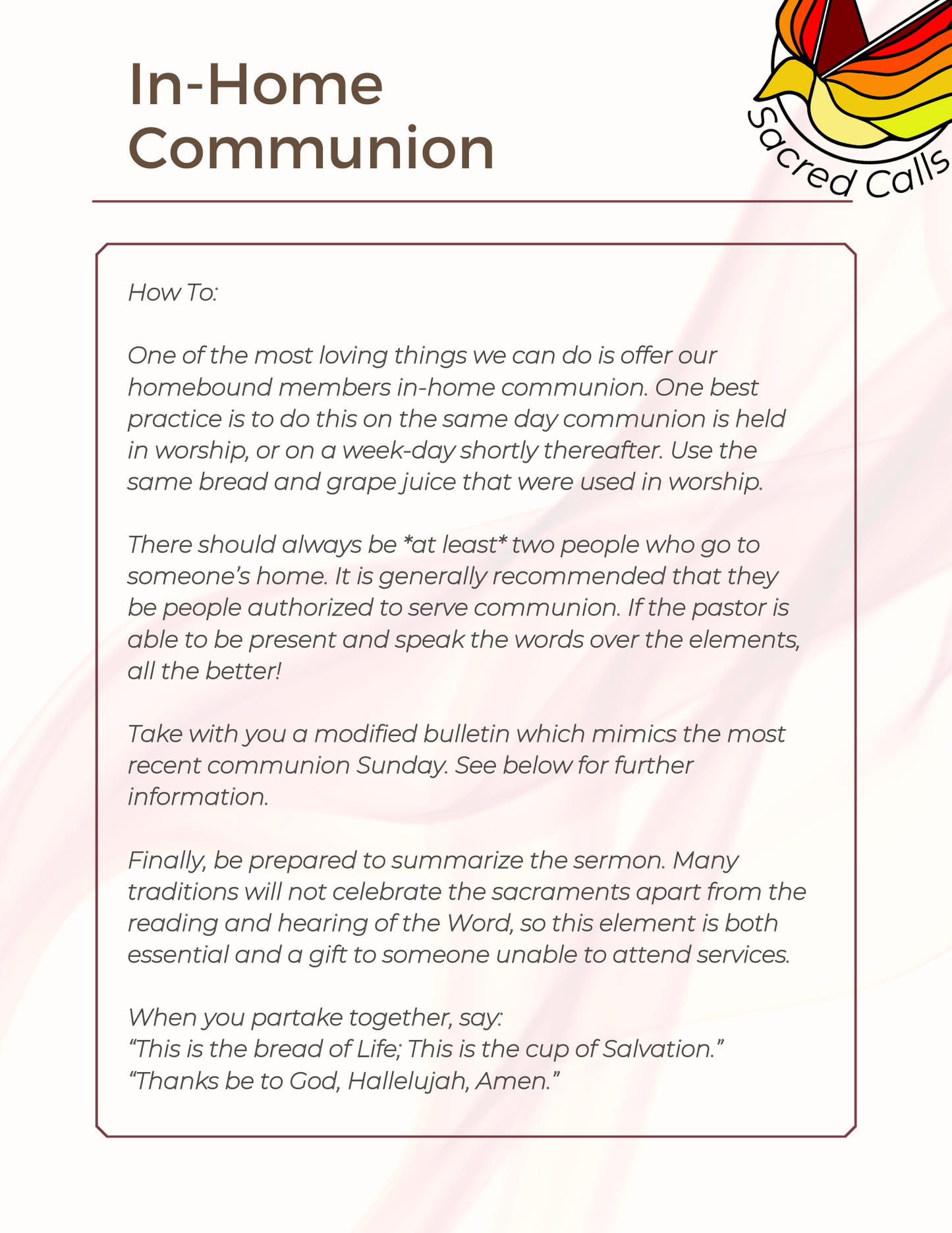 Members ask all the time "but how do I do in-home communion?" Well, with this handy guide, you can just offer it to them and they've got all the tools they need!