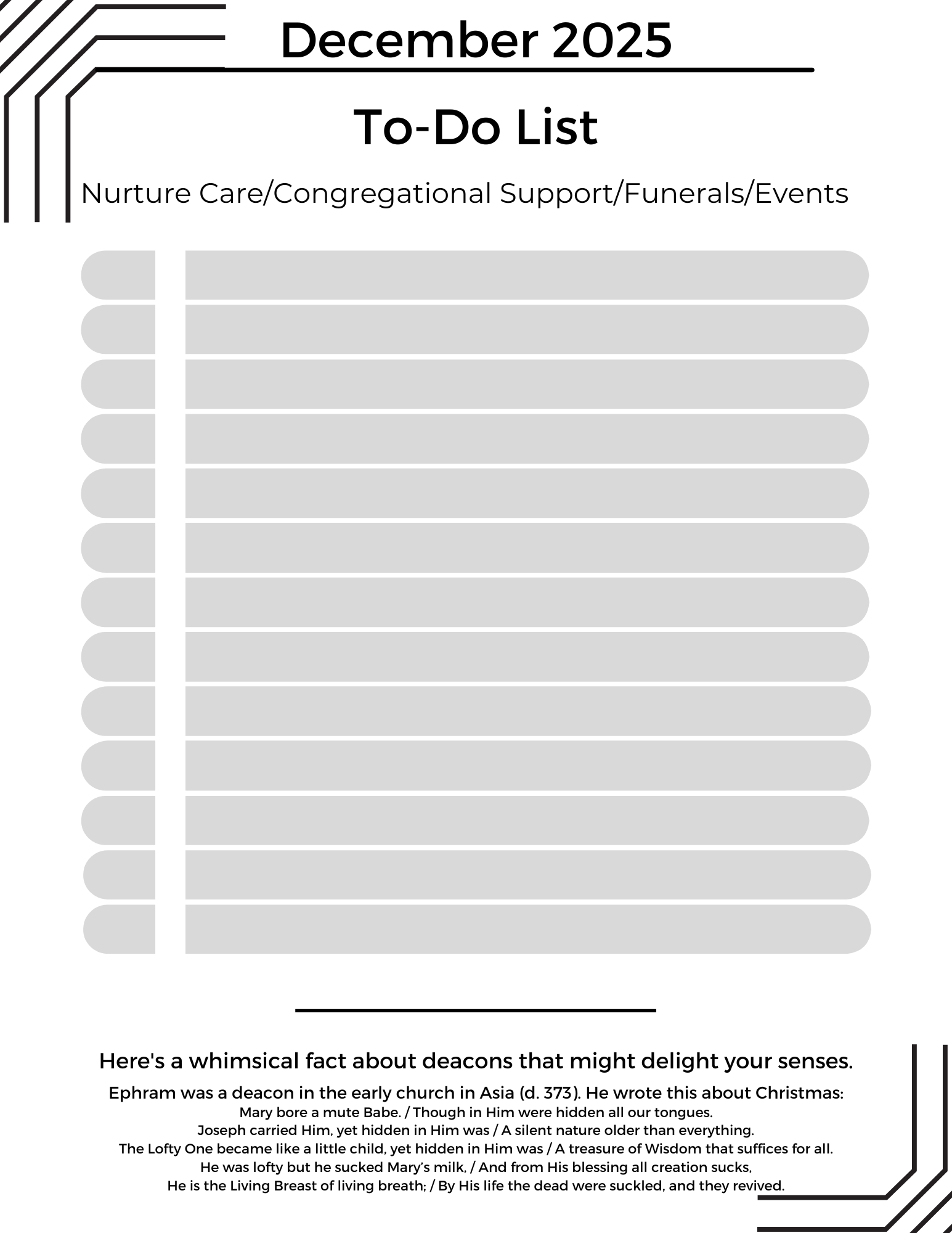 Make your deacon meetings easier, clearer, and more fun with these journals. Inside you'll find various ways of keeping things moving, opportunities to be educated and dream big, and helpful notes for processing and managing information. There are sample agendas, questions to ponder, a calendar to look ahead, and little fun facts we just like.