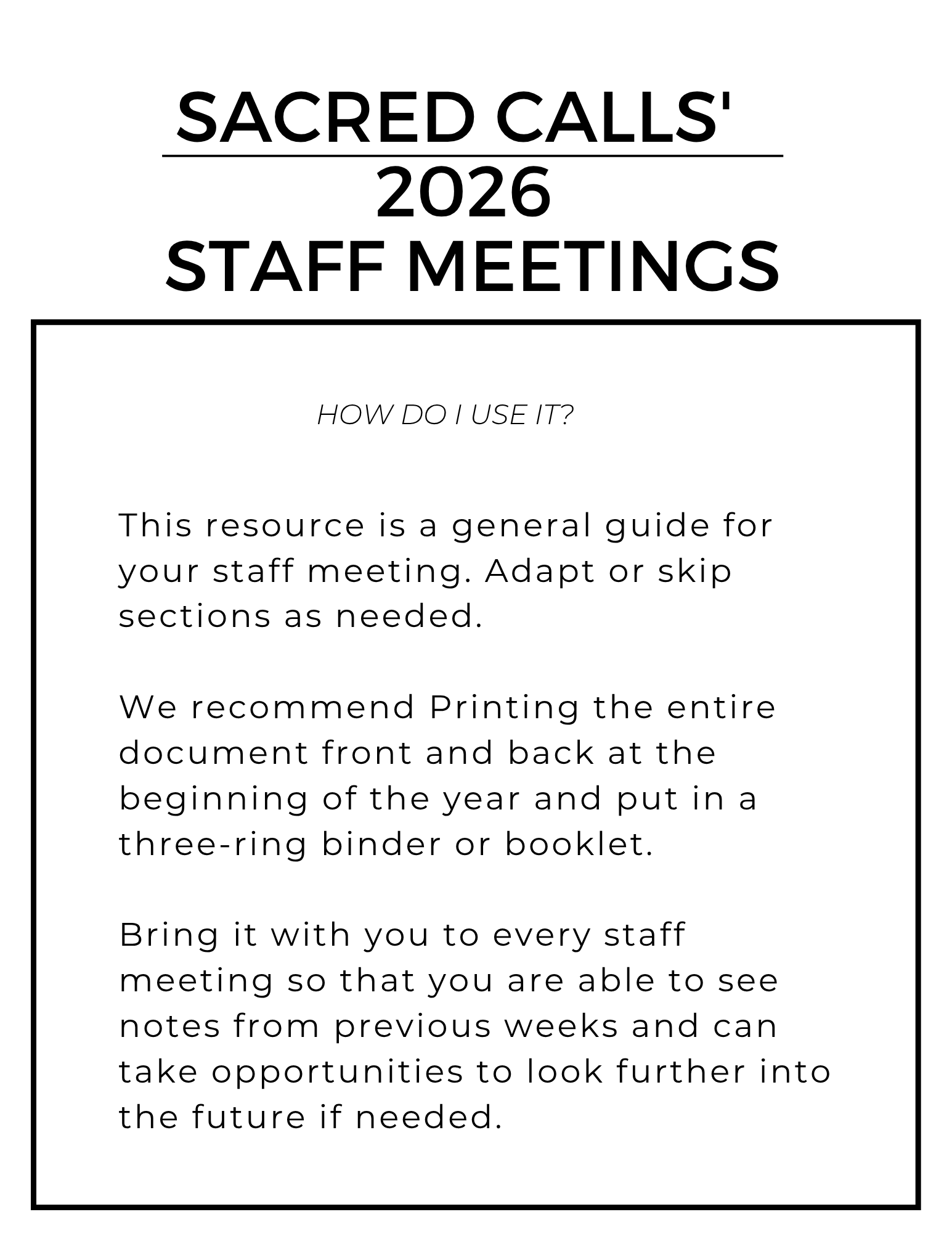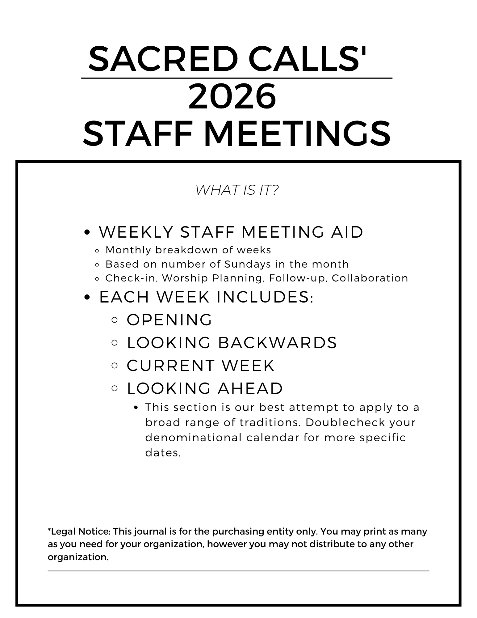 If you're in a multi-staff church, you have staff meetings. They are THE best way to make sure everyone is on the same page and working toward the same goals. And if you need help getting them organized and on track, let our journal help! In these pages you will find weekly staff meeting guides with opportunities to connect in various ways. Plus a three-month out calendar! Calendars are awesome.